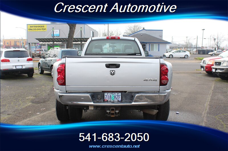 Behold a majestic 2007 Dodge Ram 3500 ST 4X4 with 157,158 miles, powered by the legendary Cummins 6.7L Diesel Turbo I6 — 350 hp and 610 lb-ft of torque — cloaked in Bright Silver Metallic Clearcoat with a resolute Medium Slate Gray interior. This workhorse arrives in excellent overall condition with only 157,000 miles (averaging less than 8,000 miles per year). Factory-standard equipment is built for duty: a reinforced heavy-duty chassis and suspension, robust cooling and drivetrain components tuned for towing and payload, anti-lock braking, driver and passenger airbags, power-assisted steering, air conditioning, tilt steering and cruise control, an AM/FM single-CD stereo, durable easy-care seating surfaces and abundant storage — all finished with rugged steel wheels and factory tow-prep and wiring for immediate hauling capability. A rare combination of brute force, factory reliability, and low mileage — ready to command any job.