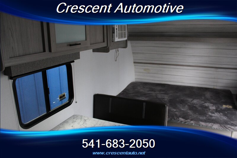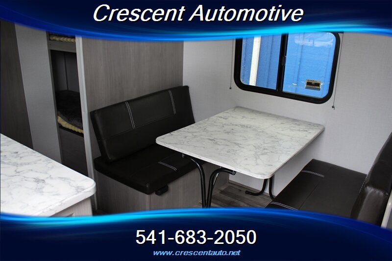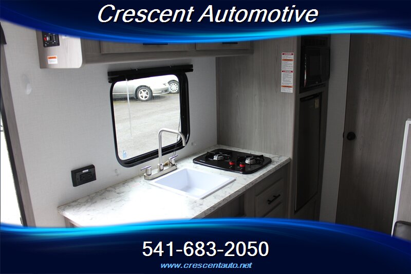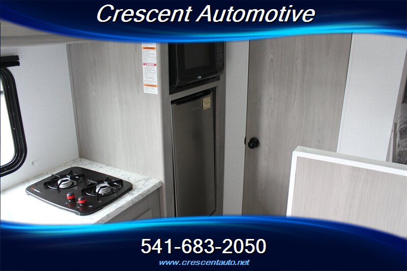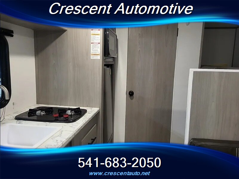 2024 Keystone Coleman Dutchmen 17B — sleek gray exterior with a matching gray interior in a compact, easy-tow travel trailer. Factory-standard equipment includes a power awning with integrated LED lighting, diamond-plate rock guard, exterior storage, manual stabilizer jacks and spare tire; inside you’ll find LED interior lighting, a convertible dinette sleeping area, a fully equipped galley with 3-burner range, microwave, stainless sink and 12V/110V/LP refrigerator, a dedicated bath with shower and skylight, wardrobe and overhead storage, 13.5k BTU A/C, propane furnace and water heater, AM/FM Bluetooth stereo with speakers and TV hookup, USB charging ports, and standard safety features (smoke/CO detectors, fire extinguisher). It's in very good overall condition, it’s ready for your next getaway.